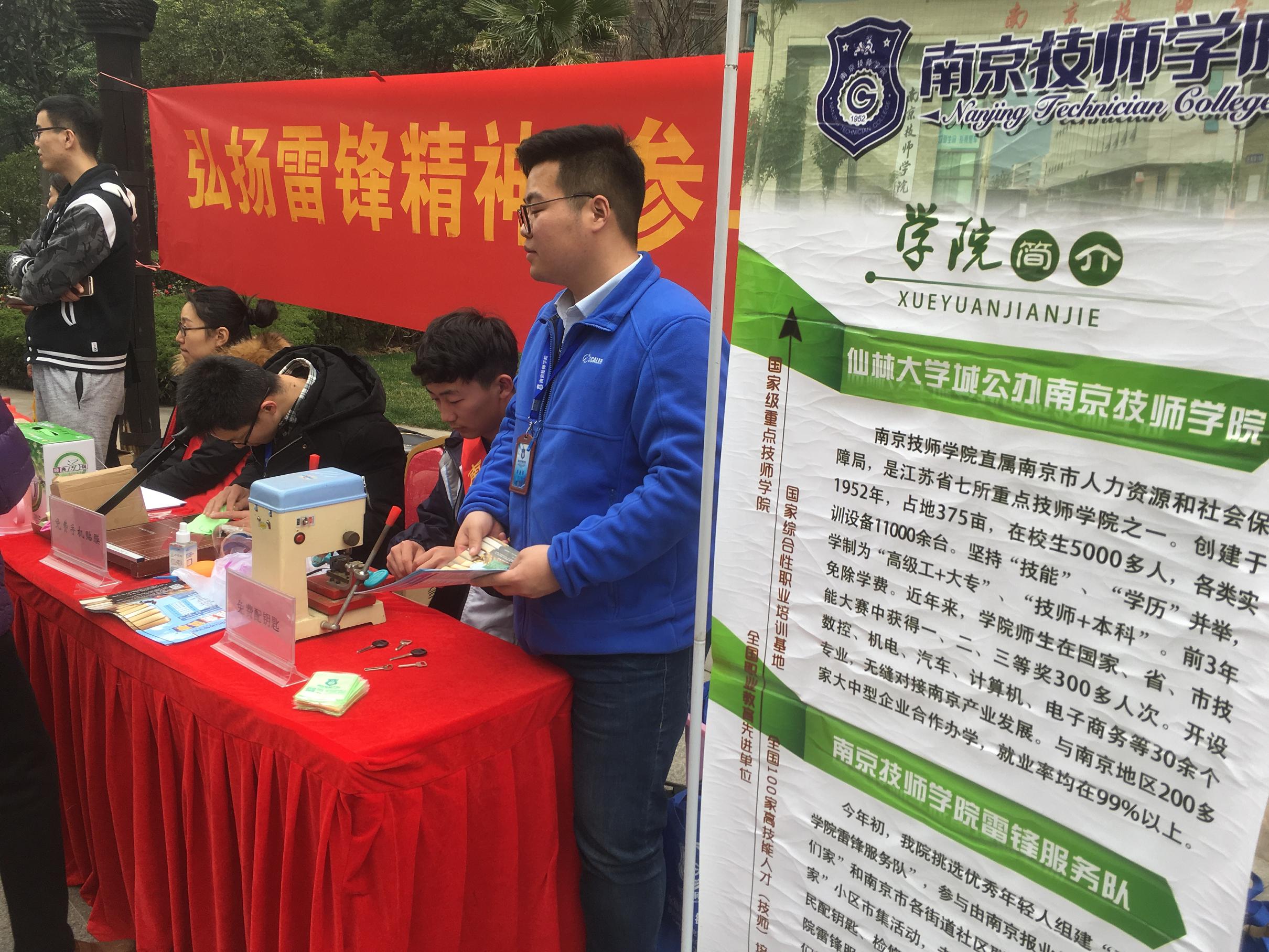 3月5日学雷锋日,我院师生组成的“南京技师学院雷锋服务队”同南京报业集团龙虎网“我们家”智慧社区APP和各社区联合主办的小区市集活动。弘扬雷锋乐于助人无私奉献的精神,走进了世贸滨江新城小区,为社区的居民送上了一份微薄的温暖。