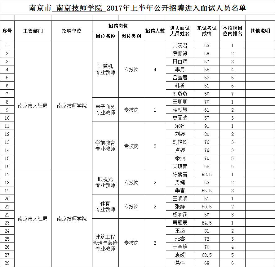 南京市 南京技师学院 2017年上半年公开招聘进入面试人员名单