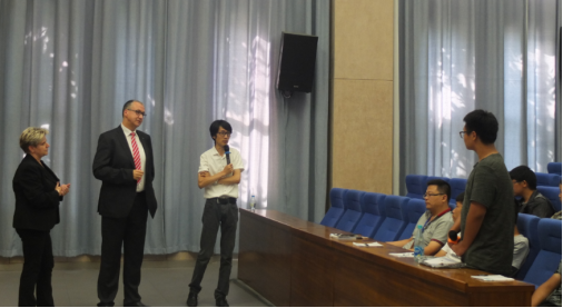下午EBZ总经理贝肯纳先生和雅堂项目主管杨传玺先生对我院18届新生进行中德班动员会,会上贝肯纳先生对德国埃尔福特培训中心和德国双元制教育做了简短介绍,杨传玺先生幽默风趣的介绍了德国风土人情和中德班情况。会上同学们踊跃提问,现场气氛热烈,会后同学们意犹未尽。