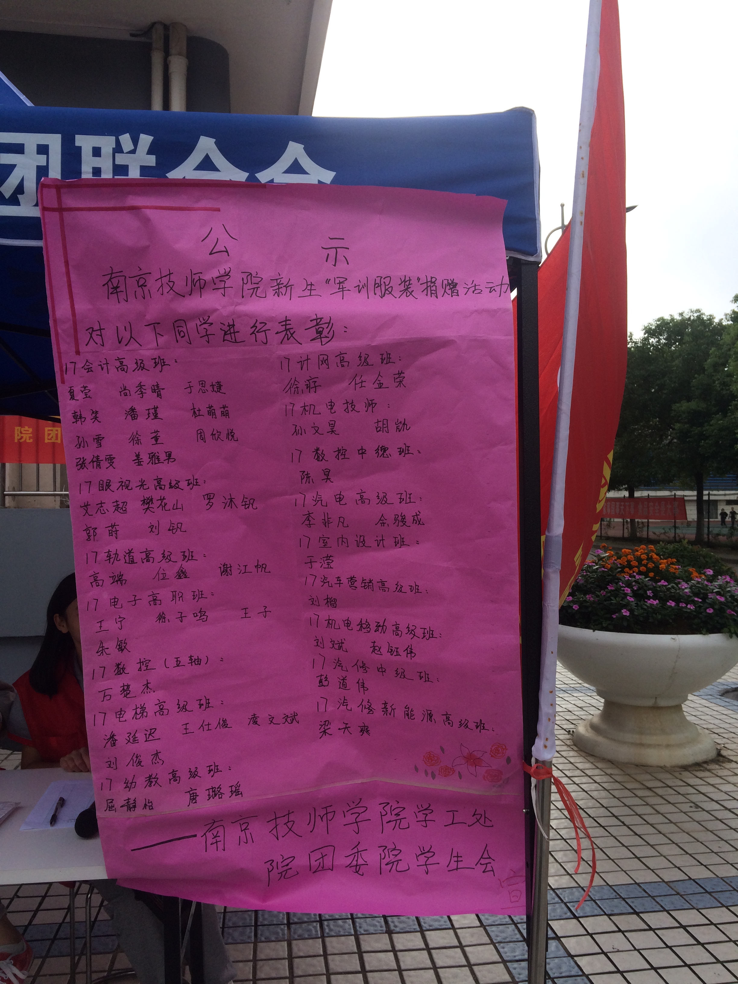 于2017年9月28日至9月29日下午,南京技师学院团委组织开展了军训服装捐赠工作。