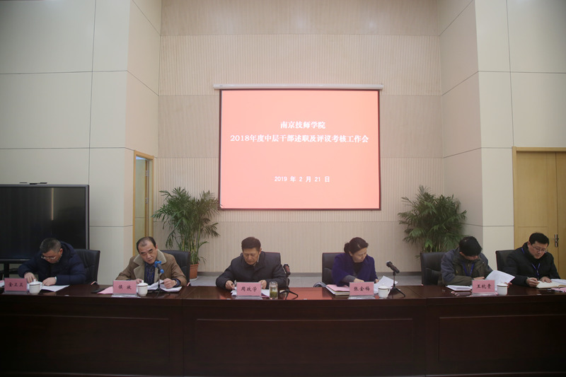 2月21日,我院召开2018年度中层干部述职及评议考核工作会。市人社局巡视员周政学以及学院领导班子、全体中层干部参加了会议。院党委书记张金梅主持会议。