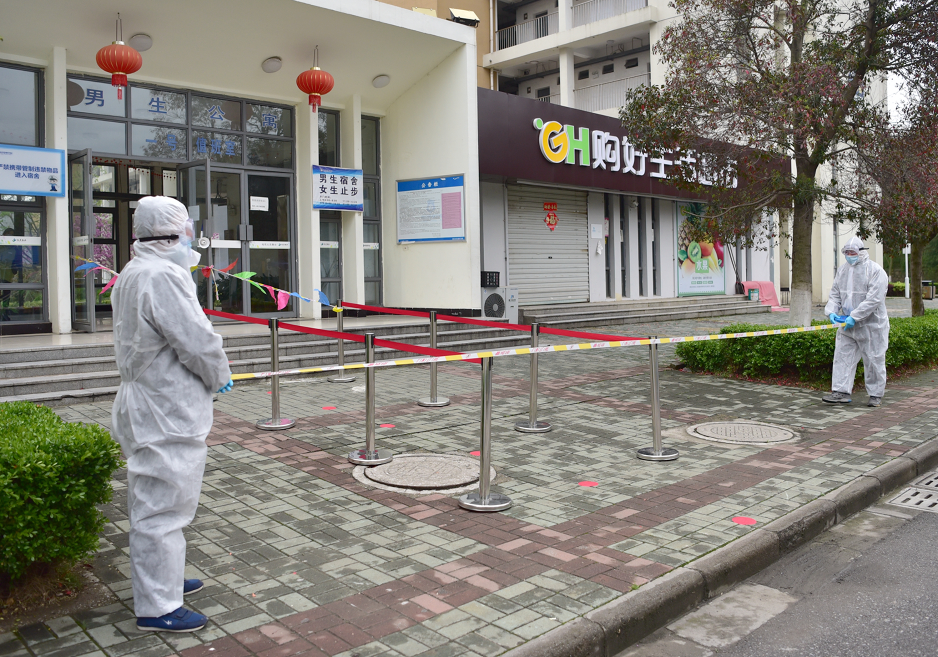 中午,住校生约20人保持1米以上的间距,按要求从管控通道按顺序进入宿舍。