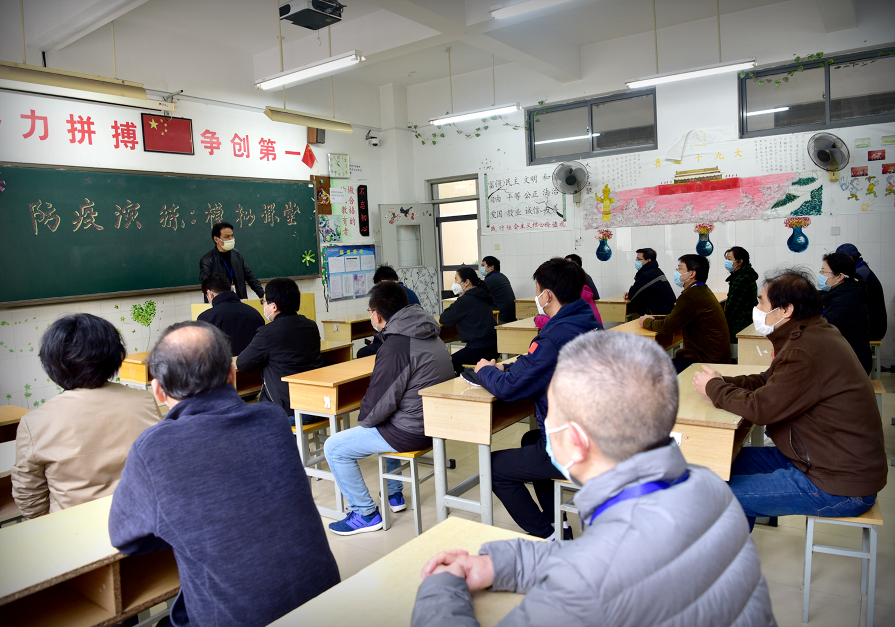 约20名学生在教室全程佩戴口罩上课,单人单座并与其他同学保持一定距离,课前、课间、午休时间开窗通风,放学后对教室地面和课桌椅进行杀毒。