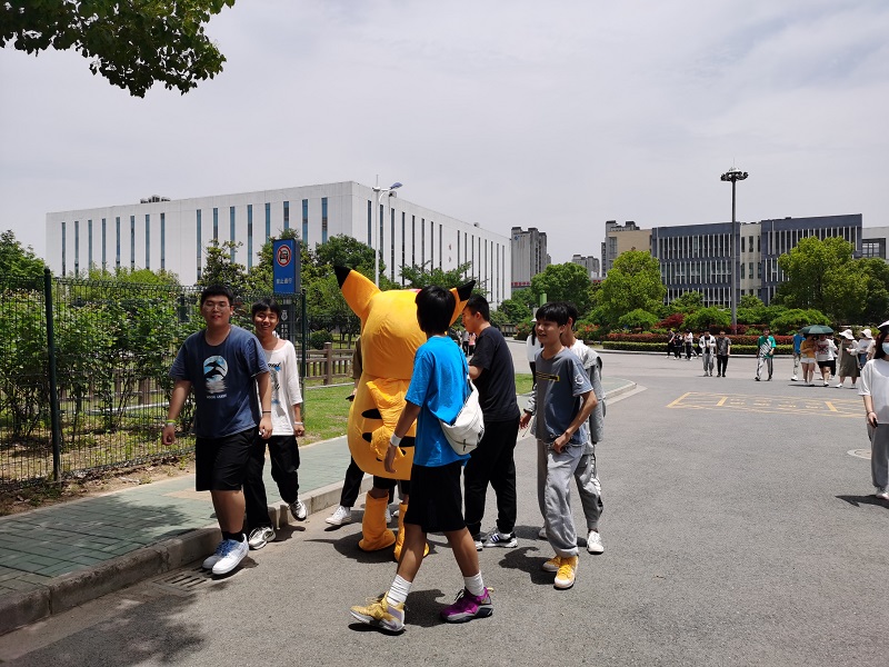 两名成员分别穿着卡通人物服装,给路过的同学送去“爱的抱抱 ”,让同学们感受爱的温暖。