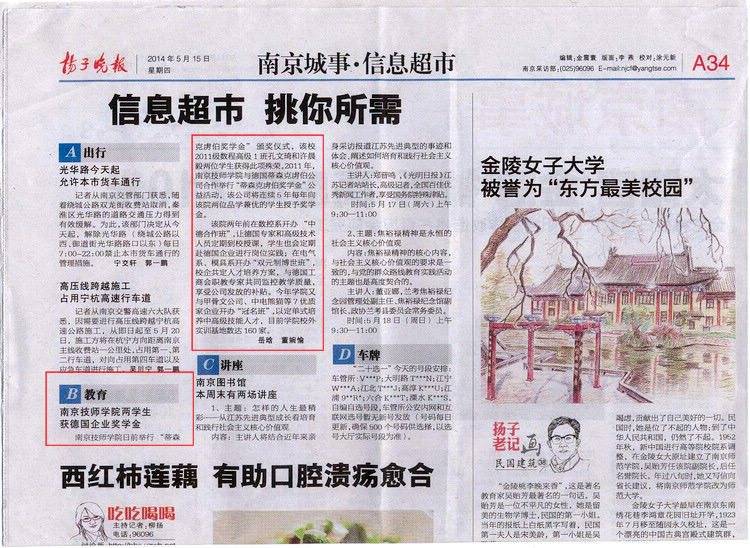 《扬子晚报》A34版—南京技师学院两学生获德国企业奖学金