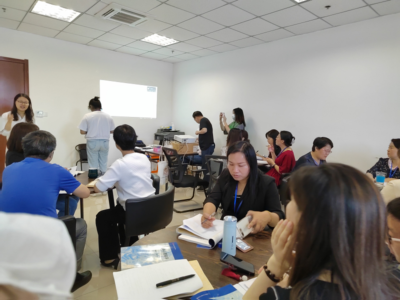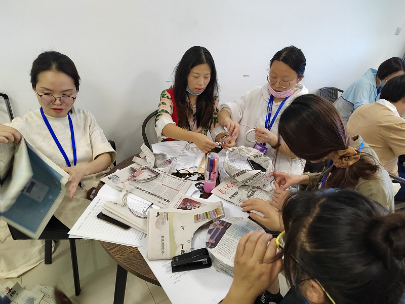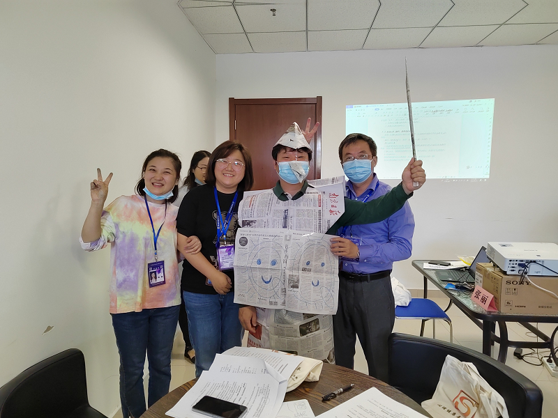 本次团体辅导培训分多场进行,以不同的主题指导参训教师做好团体辅导活动。每次活动以热身游戏开场,采用体验式培训方式带领专兼职心理教师开展了团体心理训练活动。在完成了团队组建各环节的活动后,各个团队的成员们分工合作齐心协力,通过完成团队报纸创意“自我探索”“生存选择”“你说我画”“解开千千结”“开心加油站”等团队任务,开拓了集体智慧,展示了个人才艺,秀出了团队的魅力和风采,实现了团队赋能。