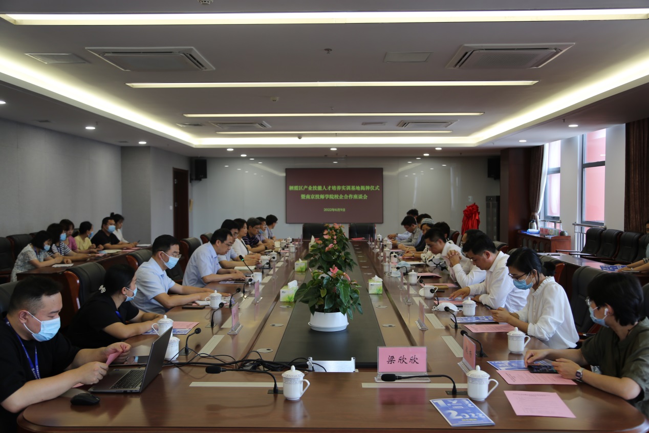会上,区人社局与学院共同为栖霞区产业技能人才培养实训基地揭牌双方签订了校地合作协议。