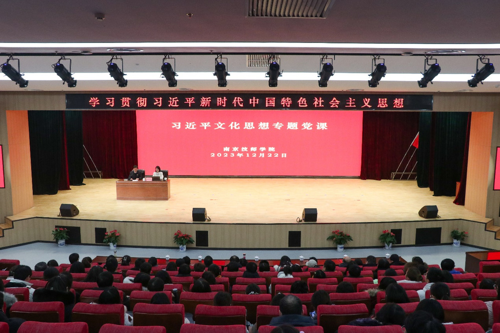 为深入学习领会习近平总书记对宣传思想文化工作作出的重要指示精神,让教师更好的担当起传播习近平文化思想的新使命,12月22日下午,南京技师学院邀请南京市委党校哲学与文化教研部副主任、教授胡晶晶开展“学习习近平文化思想”专题党课。院领导班子成员、全体党员和教职工300余人聆听了讲座。