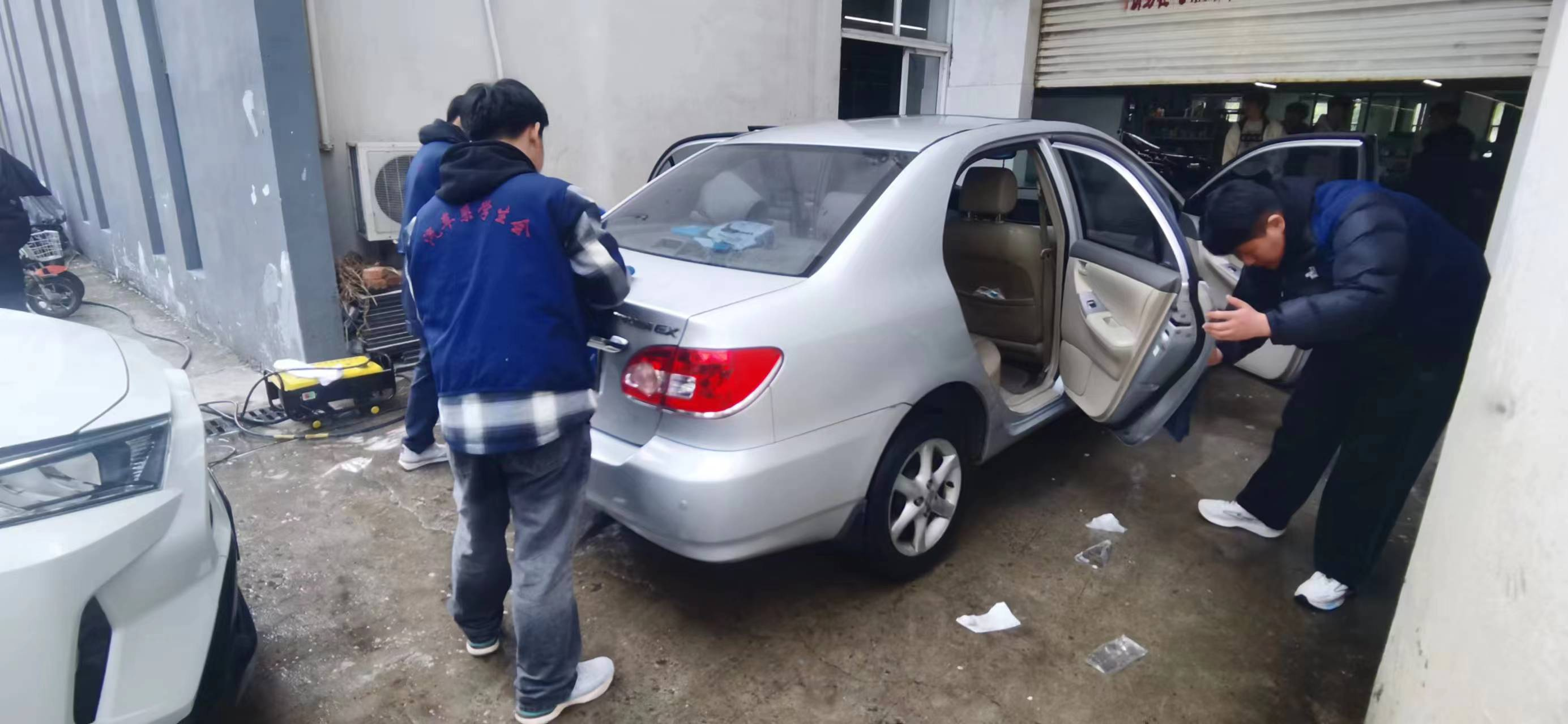 在清洗过程中,同学们利用洗车设备对作业车辆外部各方位进行冲洗,并用长拖把沾上洗车液对车辆外部进行仔细擦拭,还对车辆内部卫生进行全面吸尘。经过全面清洗后的车辆焕然一新,提升了车容车貌。