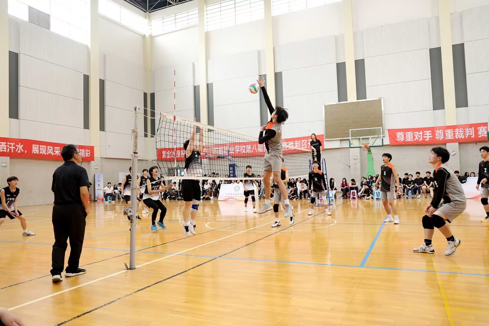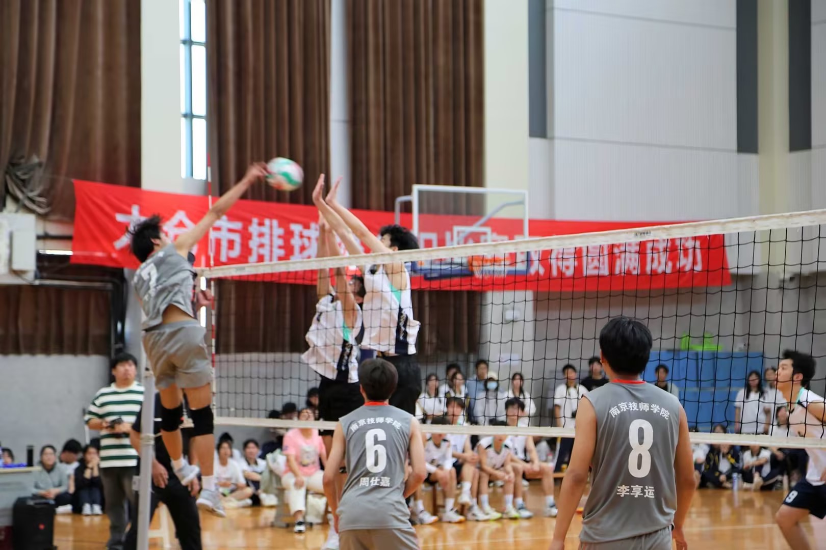 比赛中,学我院排球队男子通过紧密配合、默契传球,不仅完成了多次精彩的扣杀,在防守端也展现出顽强的毅力,尤其是关键时刻的拦网和救球,更是体现了团队间的默契与信任。