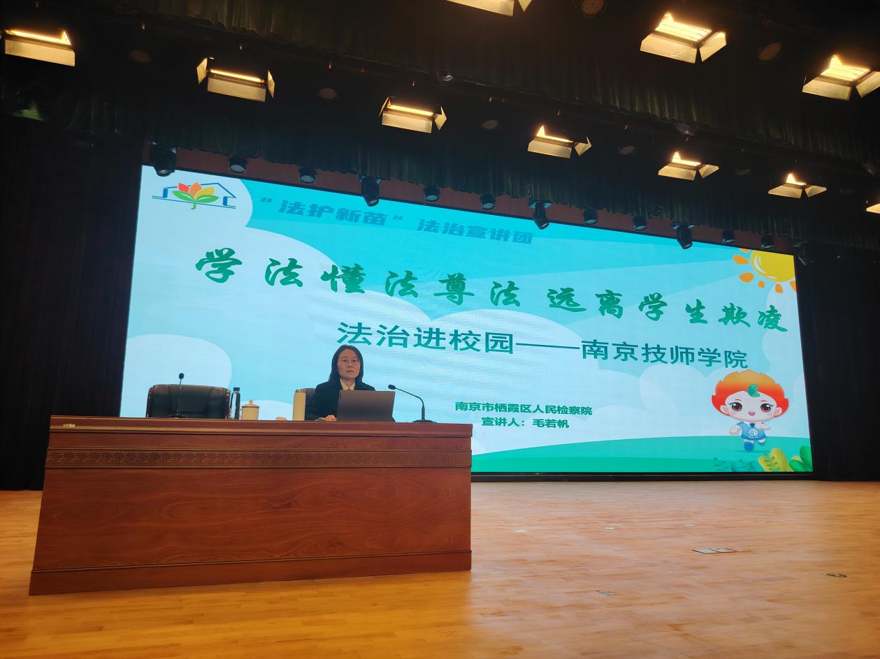 为深入推进学生法治教育工作,提升学生法治思维和自我保护能力,积极营造知法、遵法、学法、用法的浓厚氛围,近日,学院法治副校长、栖霞区人民检察院毛若帆检察官到校为学生开展了“树立法治意识 绽放绚烂青春”的法治教育讲堂。