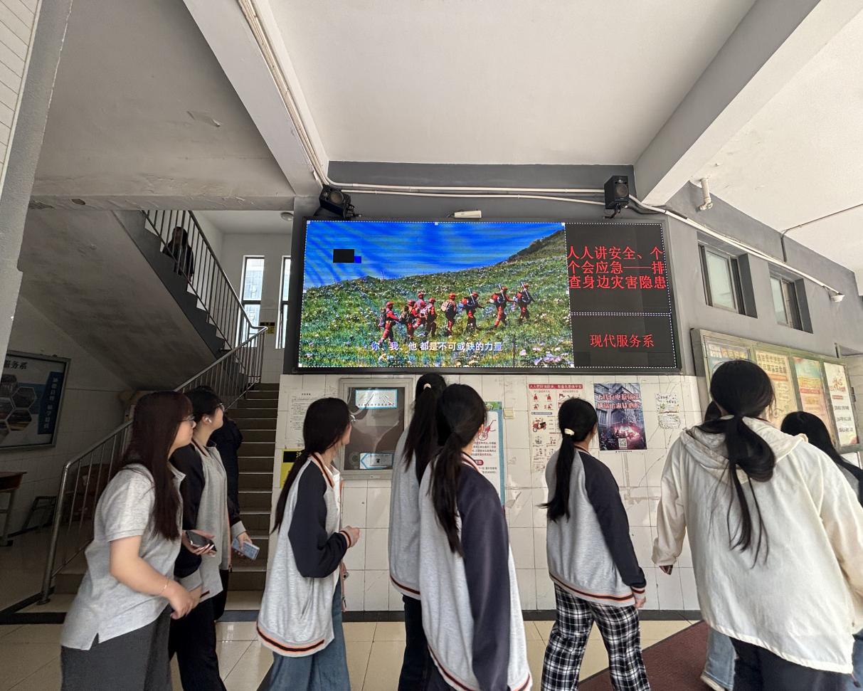 学院在教学楼、食堂、宿舍等人员密集场所悬挂醒目的宣传标语,利用校园电子屏滚动播放防灾减灾科普视频、避险常识和警示标语,覆盖师生员工5000余人次,有效强化了全员安全防范意识。