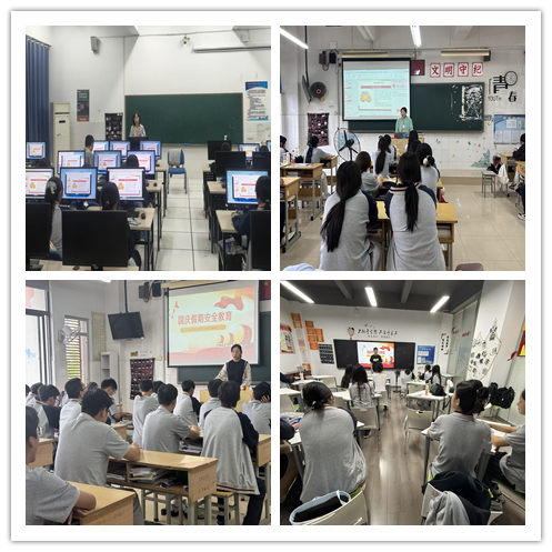 班会伊始,各班以“喜迎国庆节”为主题,通过播放国庆主题纪录片片段、分享祖国发展成就等形式,带领同学们回顾新中国成立以来的辉煌历程,激发大家的爱国情怀与民族自豪感。随后,班会聚焦“国庆假期安全须知”,重点围绕四大安全领域展开:一是出行安全,提醒学生遵守交通规则,避免前往人员密集的高危场所,乘坐正规交通工具;二是居家安全,强调用电、用火、用气安全,警惕电信网络诈骗,不泄露个人信息;三是防疫安全,要求学生做好个人健康监测,出现不适及时就医,不前往疫情重点地区;四是严防溺水,提醒学生做到防溺水“六不”。