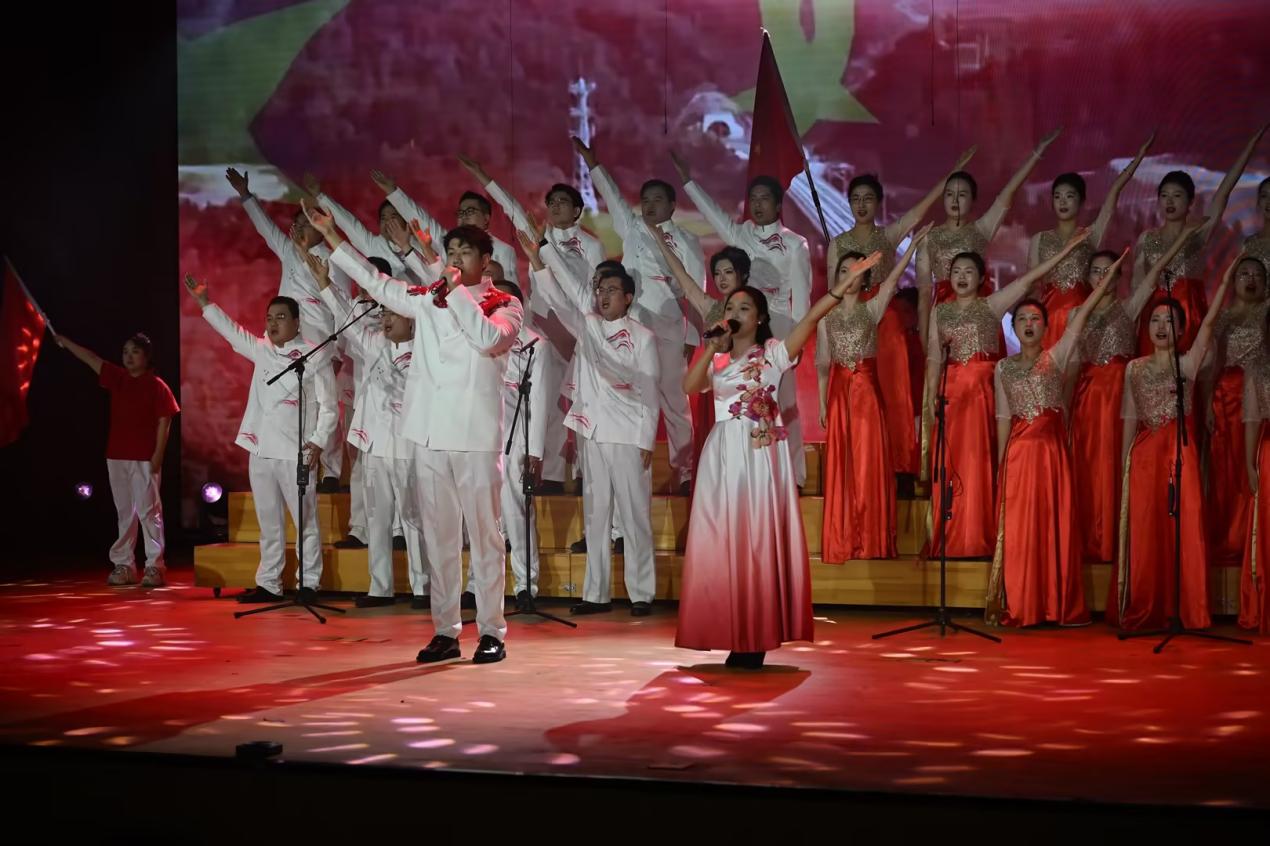 比赛中,学院各党支部和团总支共选送了12支队伍同台展示。党员教师们先后呈现了《中国人》《映山红》《南泥湾》《领航》等经典曲目,用真挚的情感、嘹亮的歌声诠释了党员的责任与担当;团员同学们以《红旗飘飘》《四渡赤水出奇兵》《我爱你中国》《天耀中华》等歌曲献礼,展现了新时代青年的昂扬风貌。参加表演的师生们精神饱满、编排精巧,舞台上灯光与旋律交融,歌声与掌声共鸣,一首首红歌穿越时空,既重现了救亡图存的峥嵘岁月,又唱响了新时代的奋进之歌。演出接近尾声,学院广播台的同学们还特别奉献了情景舞台剧《我有一束光》,以深情演绎传递信仰力量,赢得了全场阵阵掌声。