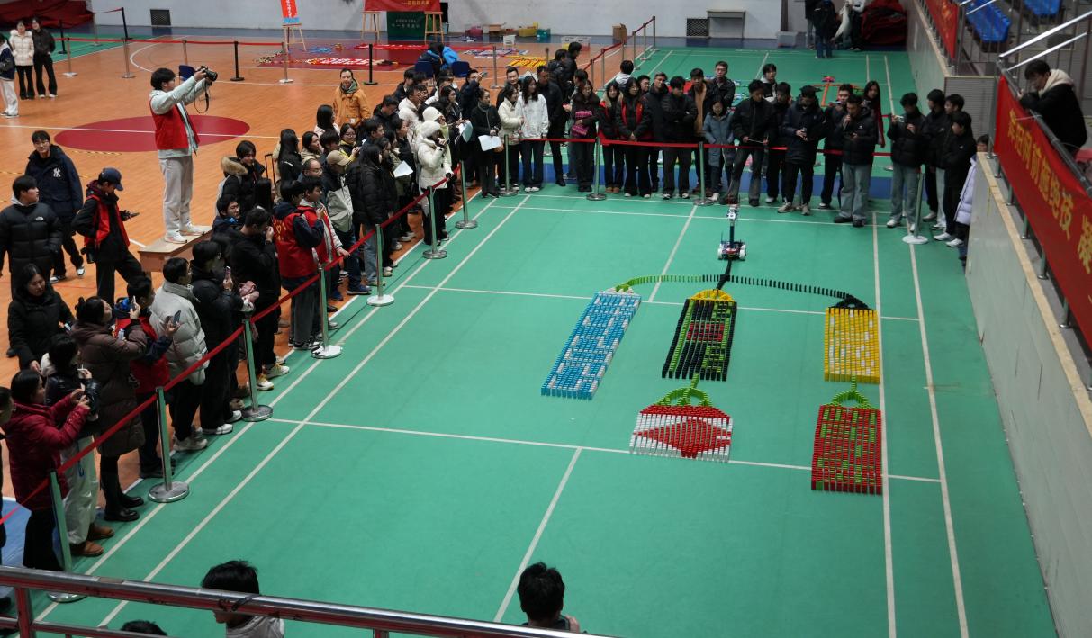 推倒仪式环节,随着导引牌应声倾倒,骨牌依次联动,场面震撼人心。各参赛队队长详细讲解作品的设计理念与深层象征意义,让在场师生在视觉盛宴中重温峥嵘岁月,感悟家国情怀及工匠精神。